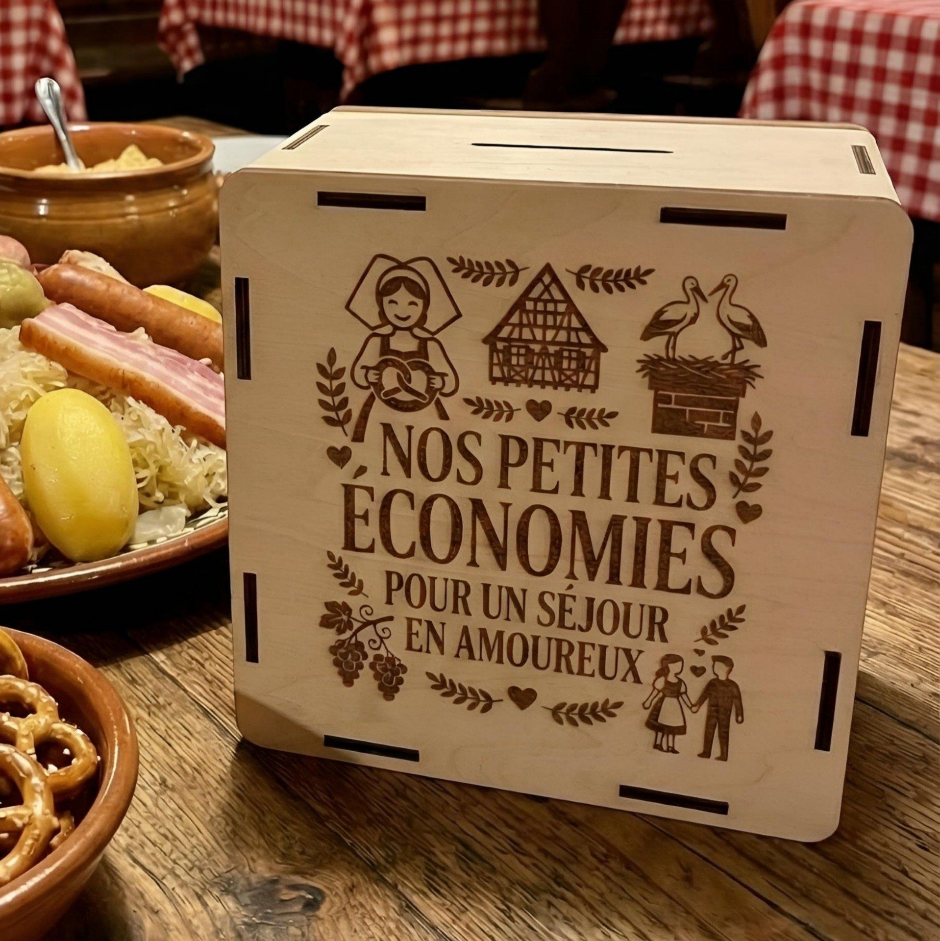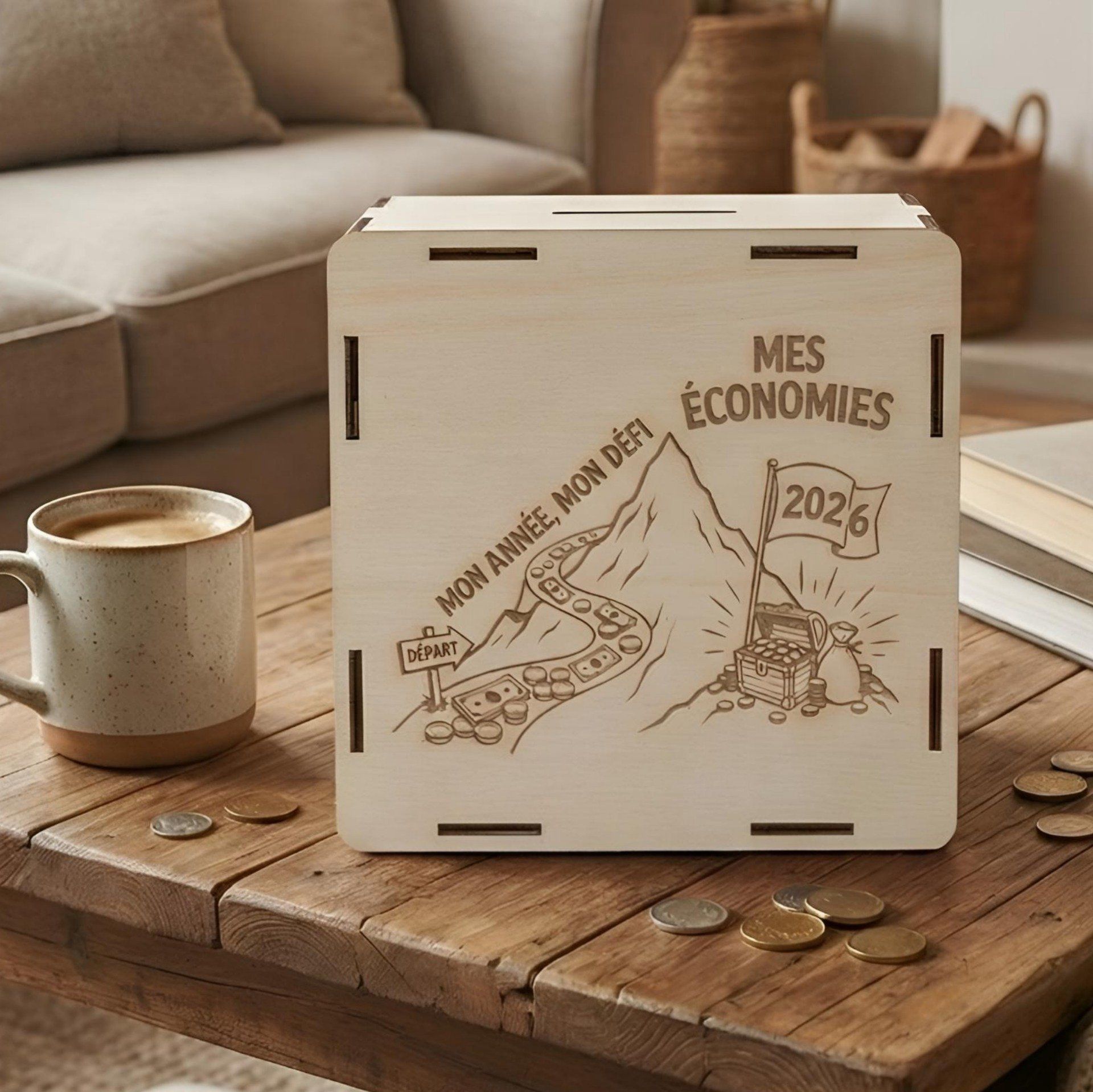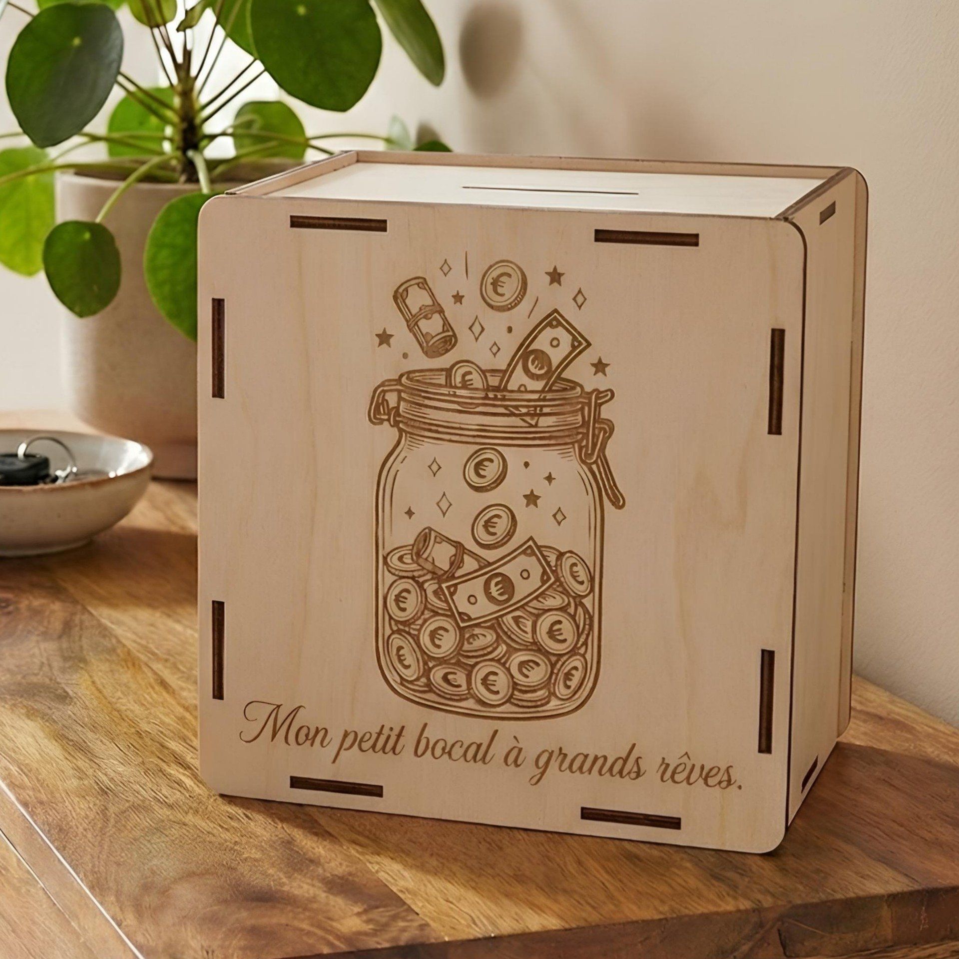 La tirelire est découpée puis gravée sur mesure en bois contreplaqué, dans mon atelier en France, avec soin.
